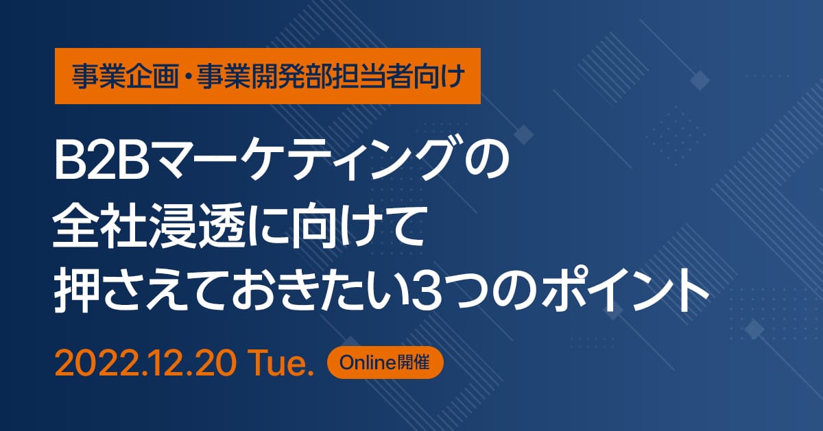※本セミナーは、B2B企業(エンドユーザーが企業様)の方を対象としております。B2C企業の方、広告代理店及び同業の方、個人事業主の方につきましてはお断りさせていただいております。